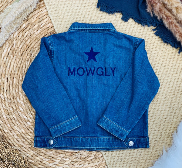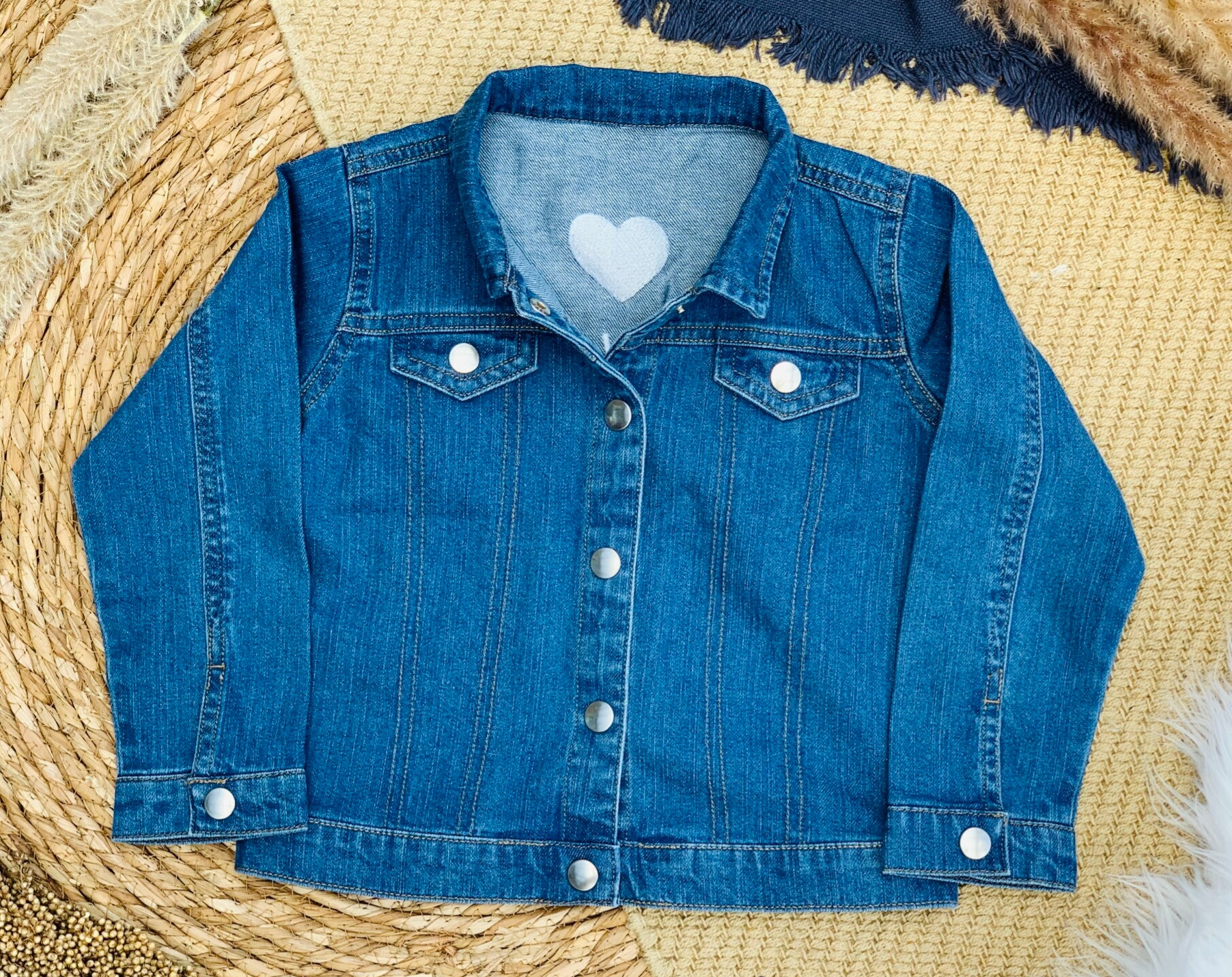 Omschrijving: Kind, Spijkerjack, Denim, Hart, Ster, Rood, Wit, Naam