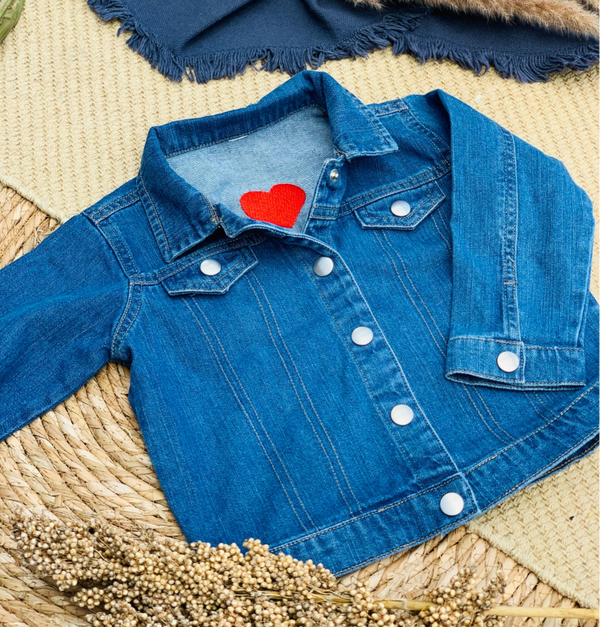 Omschrijving: Kind, Spijkerjack, Denim, Hart, Ster, Rood, Wit, Naam